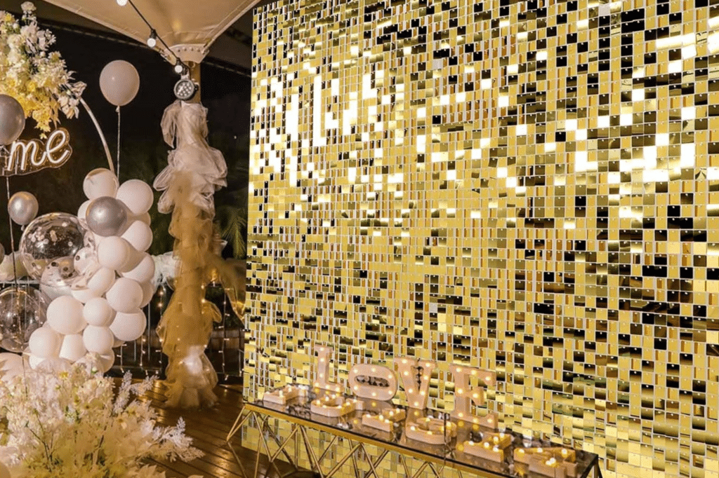 Kiiltävä ja eläväinen paljettiseinä on täydellinen tausta valokuville, selfieille ja videokuvaukselle. Paljettiseinän värivaihtoehtoina ovat kulta ja hopea. Tarvitsemme pääsyn juhlatilaan noin tuntia ennen juhlan alkua paljettiseinän asennusta varten.